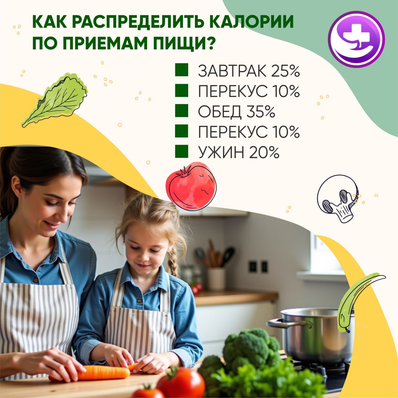 Распределение калорийности по приёмам пищи выглядит следующим образом:
